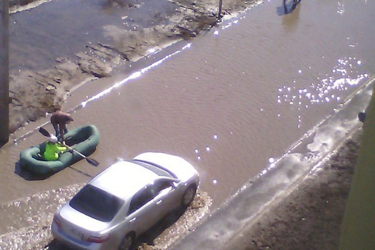 Омские дороги с приходом весны стали притчей во языцех. Ранее жители города делали многочисленные фотожабы с затопленными улицами: на отфотошопленных снимках то тут, то там появлялись подводные лодки, противопехотные мины, лодки, гондольеры... Одна из картинок воплотилась в жизнь!